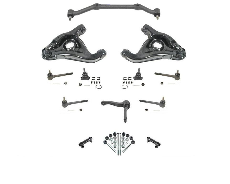 Este artículo es un kit de chasis nuevo de 14 piezas. Contiene dos rótulas superiores, dos rótulas inferiores, brazo tensor, eslabón central, extremos de barra de dirección interior y exterior, eslabones de barra estabilizadora y manguitos de ajuste. Se ajustará a las siguientes marcas y modelos: