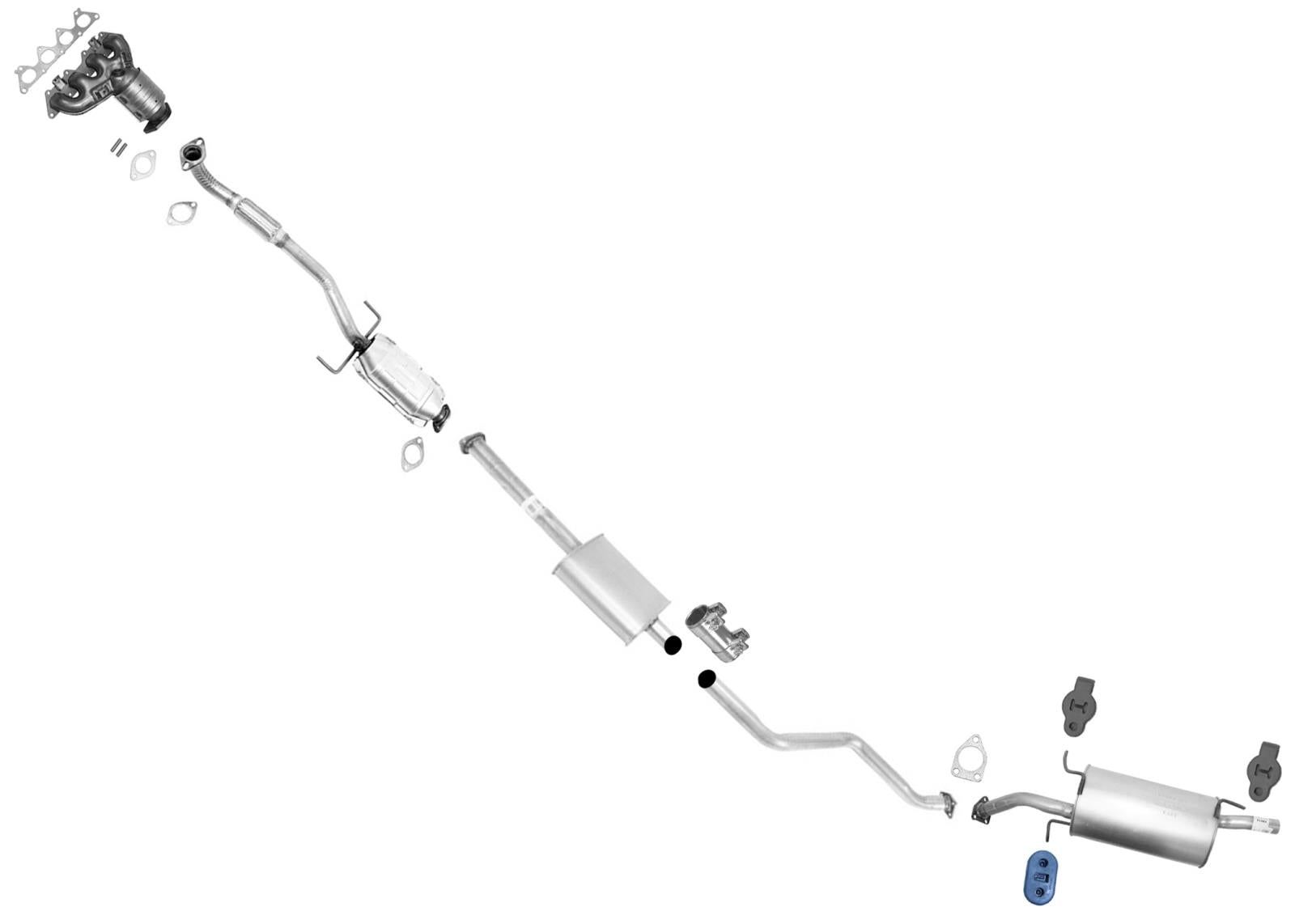 This item is a new OE Style replacement direct fit bolt-on Catalytic Converter, Resonator, Rear Muffler with Hanger, Clamps & Gaskets
