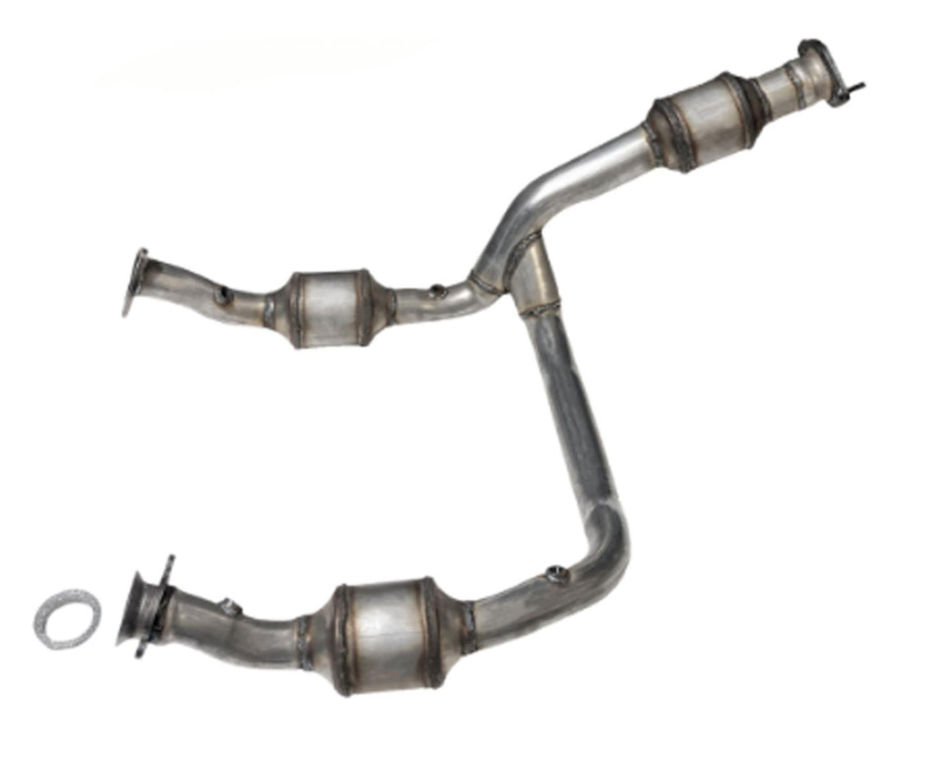 1x Part# 19758 Engine Y Pipe with (3) Catalytic Converters, with gaskets. (4) O2 Port. Side#1, 3 Bolt Loose Flange Side#2, 2 Bolt Loose Flange inlets, 2 Bolt Fixed Flange outlet